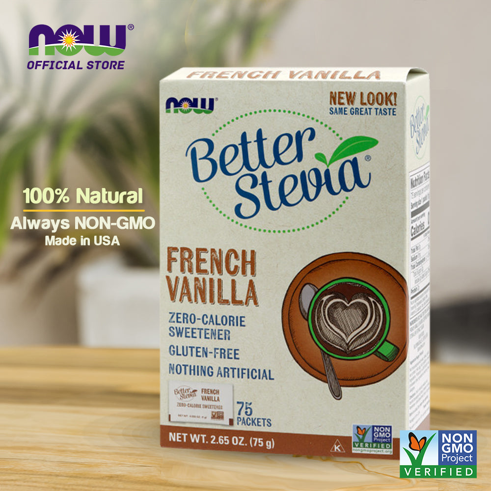 NOW Foods, BetterStevia, French Vanilla, Zero-Calorie Sweetener, Gluten-Free, Certified Non-GMO, 75 Packets/Box, 2.65 oz (75 g)