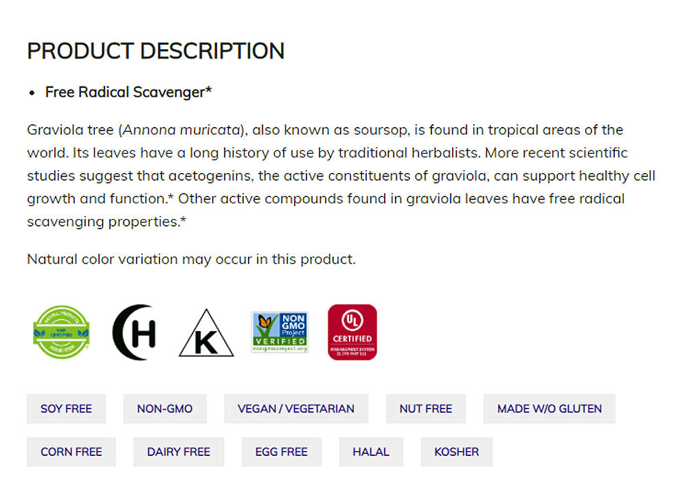 Ingredients (Computed) : Amount per Serving % Daily Value * Daily Value not established. Soursop (Graviola) (Annona muricata) (Leaf) 1 g (1,000 mg)