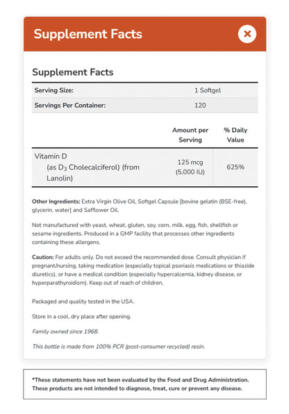 Ingredients (Computed) : 1 Softgel Servings Per Container:120Description Amount per Serving% Daily Value Vitamin D (as D3 Cholecalciferol) (from Lanolin)125 mcg (5,000 IU)625%
